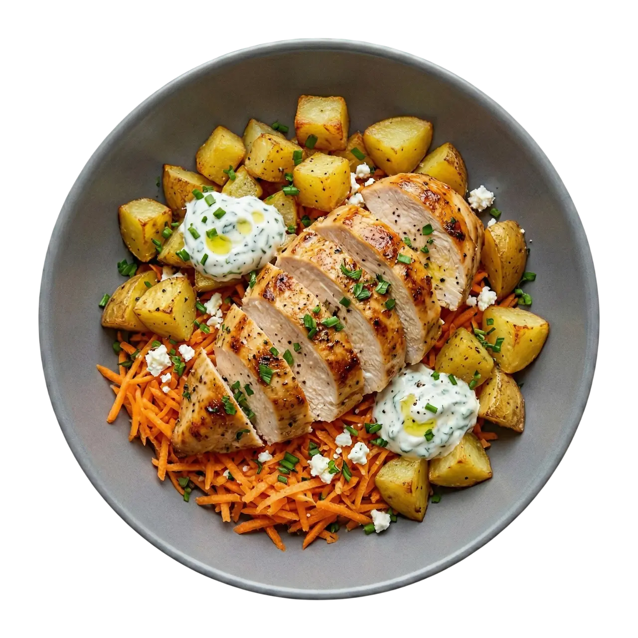 Freiland-Hähnchenbrust, geröstete Kartoffeln, Karotten, Kräuter-Joghurt, Feta