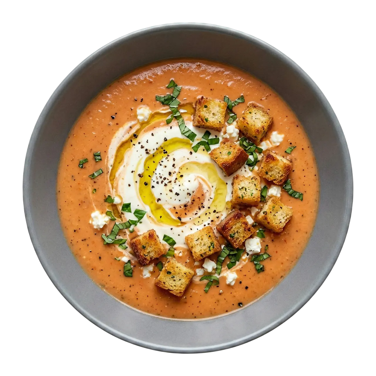 Geröstete Pflaumentomaten, frische Sahne, Knoblauch, Basilikum, Croutons